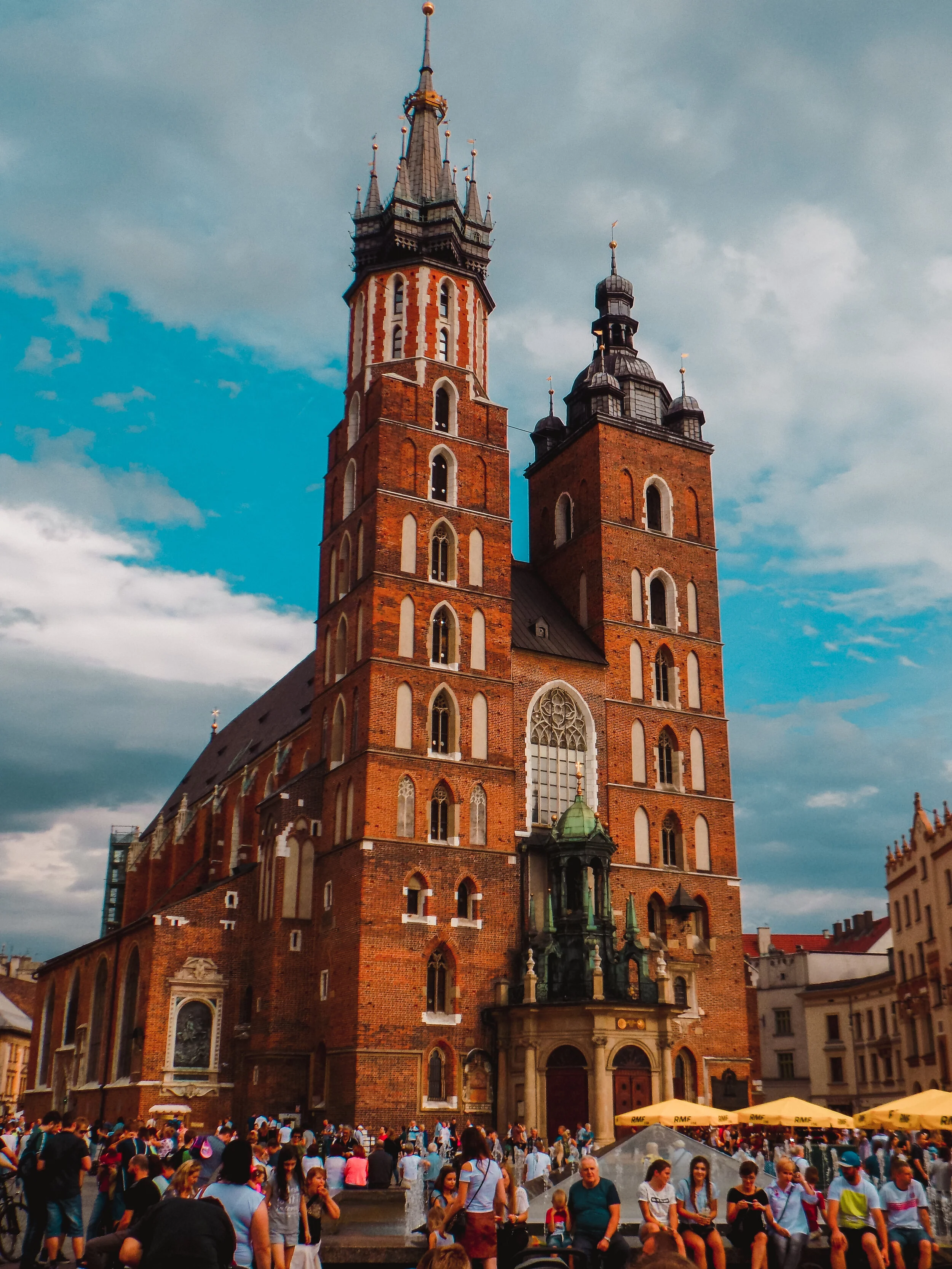 As you walk down streets towards the square, you will notice the tall thin St Mary's Basilica building! A trumpeter plays music from the taller of the two towers, every hour, every day of the year